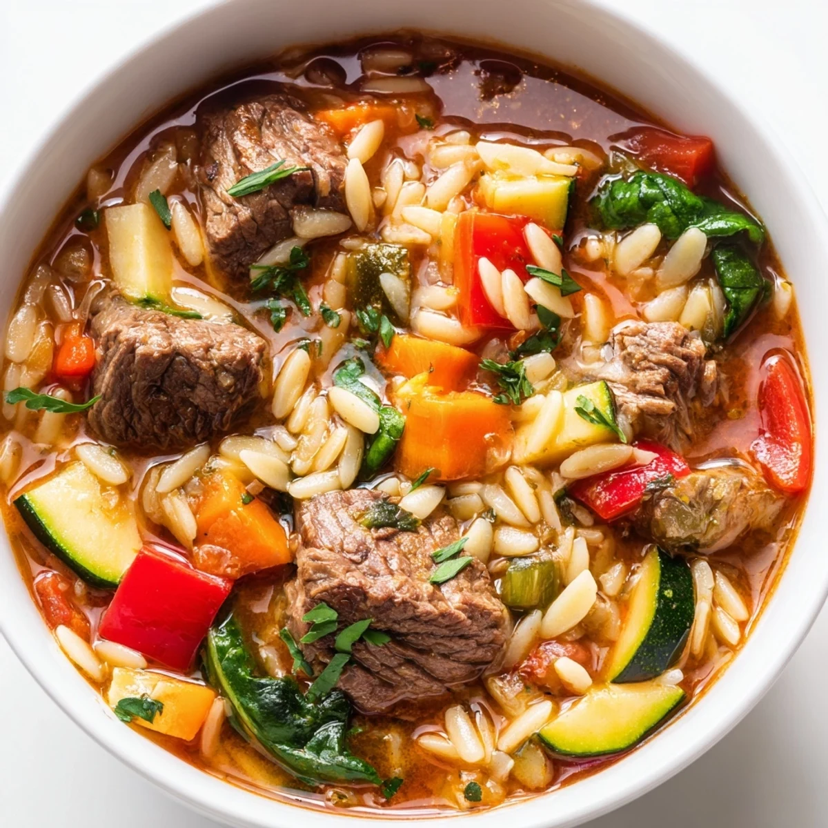 This hearty one-pot meal combines tender seared beef stew meat with orzo pasta and a colorful medley of fresh vegetables including carrots, celery, zucchini, and spinach.