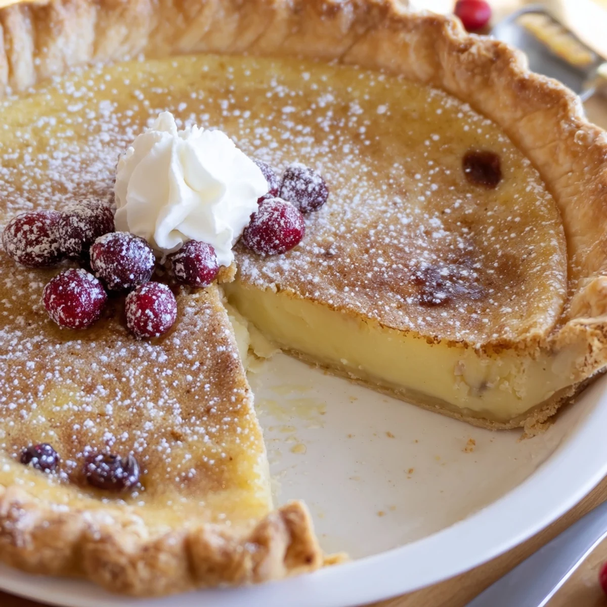 This custard bakes to a silky set inside a preformed 9-inch crust. Warm milk and cream are tempered into whisked eggs with sugar and cornstarch, then strained for smoothness. Bake at 350°F until center is slightly wobbly, cool and chill to finish setting. Finish with cinnamon and optional powdered sugar or sugared cranberries for holiday flair.
