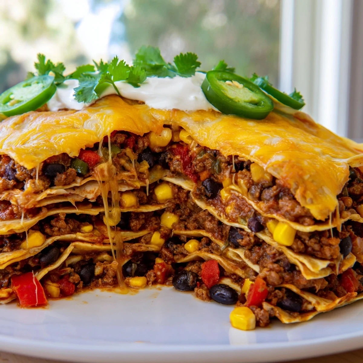 A crisp green salad with a lime vinaigrette cuts through the richness beautifully. I also love setting out bowls of fresh cilantro, sliced jalapeños, and sour cream so everyone can customize their portion. The contrast between the hot, cheesy layers and those cool, fresh toppings is what makes each bite interesting.