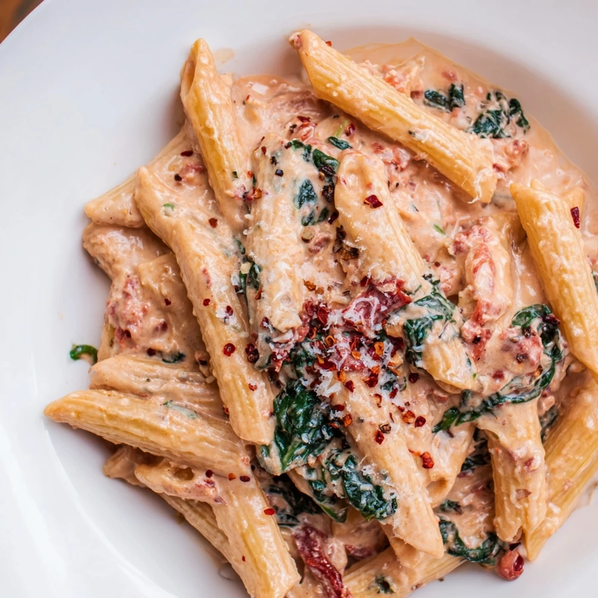 This one-pan creamy pasta combines sun-dried tomatoes, fresh spinach, and a velvety cream sauce that perfectly coats each noodle. Ready in just 30 minutes, this Italian-inspired dish comes together entirely in a single skillet, making cleanup effortless. The pasta cooks directly in vegetable broth, absorbing all the savory flavors while creating a naturally thick and luscious sauce when cream is added. Perfect for busy weeknights when you want something comforting yet elegant without spending hours at the stove.