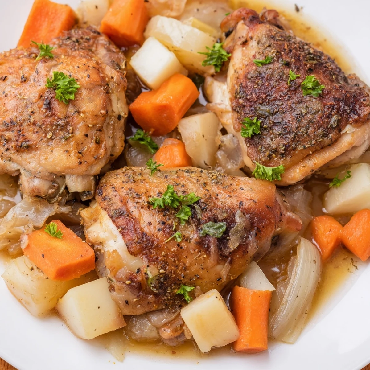 Comfort food at its finest - boneless chicken thighs become fall-apart tender after six hours of slow cooking with carrots, potatoes, celery, and aromatic herbs. The herb-infused broth creates its own rich sauce as everything simmers together. Simply season the meat, layer everything in your slow cooker, and let time work its magic.
