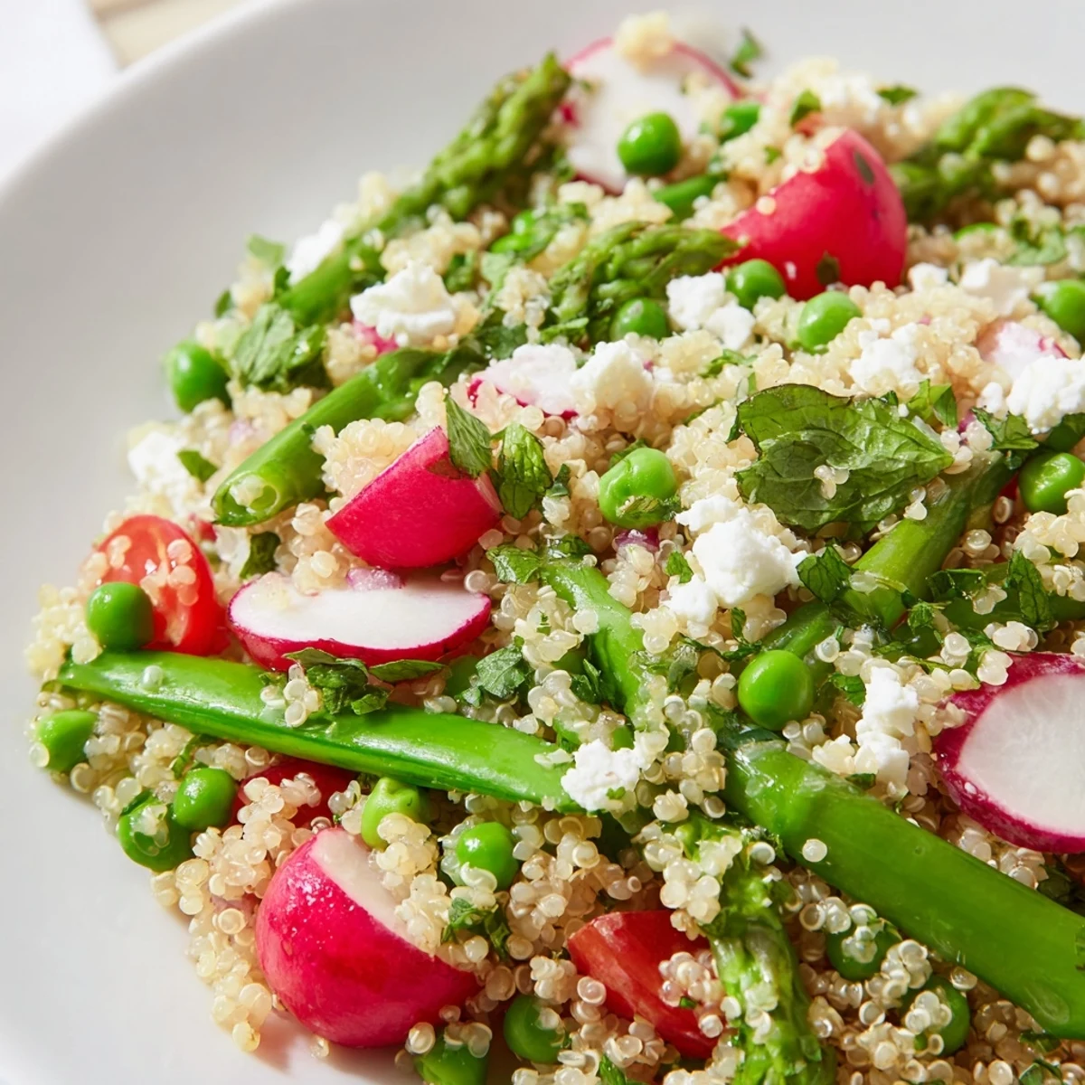 This vibrant bowl combines fluffy quinoa with crisp sugar snap peas, asparagus, radishes, cherry tomatoes, and fresh peas. Blanched vegetables maintain their bright color and crunch, while fresh parsley, mint, and chives add aromatic depth. A zesty lemon-herb vinaigrette with Dijon mustard and honey ties everything together beautifully.